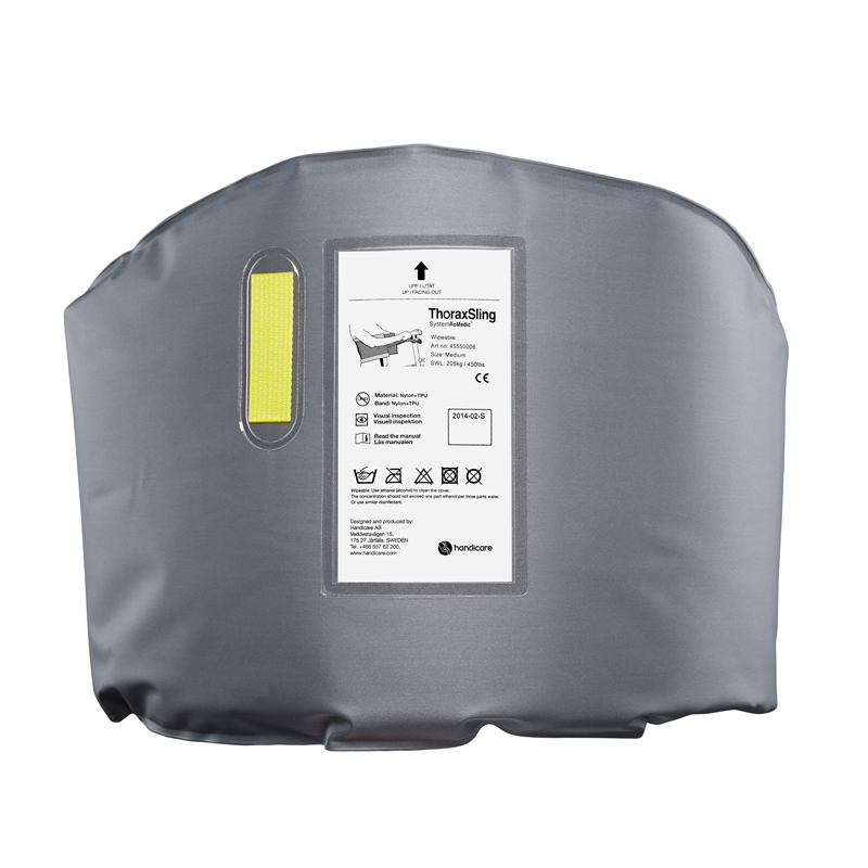 Both models of ThoraxSling are available in durable and easy-to-care-for polyester. These versions also feature armholders for hemiplegic users. ThoraxSling in polyester is intended for users weighing max 300 kg/660 lbs.